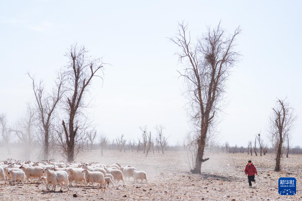 3月7日,在甘肃省张掖市甘州区碱滩镇二坝村的借牧点,东宝的儿媳拉中在放牧。新华社记者 张龙 摄