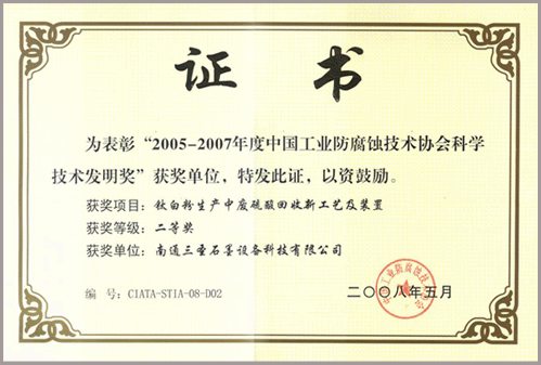 該技術(shù)通過(guò)了江蘇省科技廳科技成果鑒定,先后獲得:南通市人民政府科學(xué)技術(shù)進(jìn)步二等獎(jiǎng)、武漢市人民政府科學(xué)技術(shù)進(jìn)步二等獎(jiǎng)、中國(guó)工業(yè)防腐蝕技術(shù)協(xié)會(huì)科學(xué)技術(shù)發(fā)明二等獎(jiǎng)并在多家鈦白企業(yè)中得到了應(yīng)用。